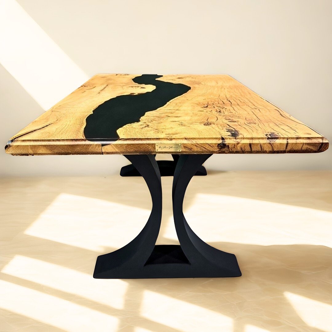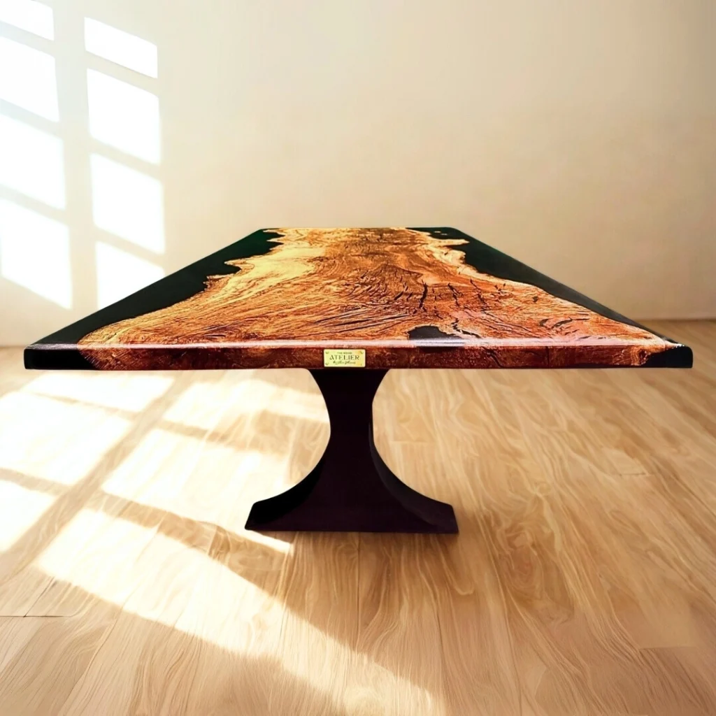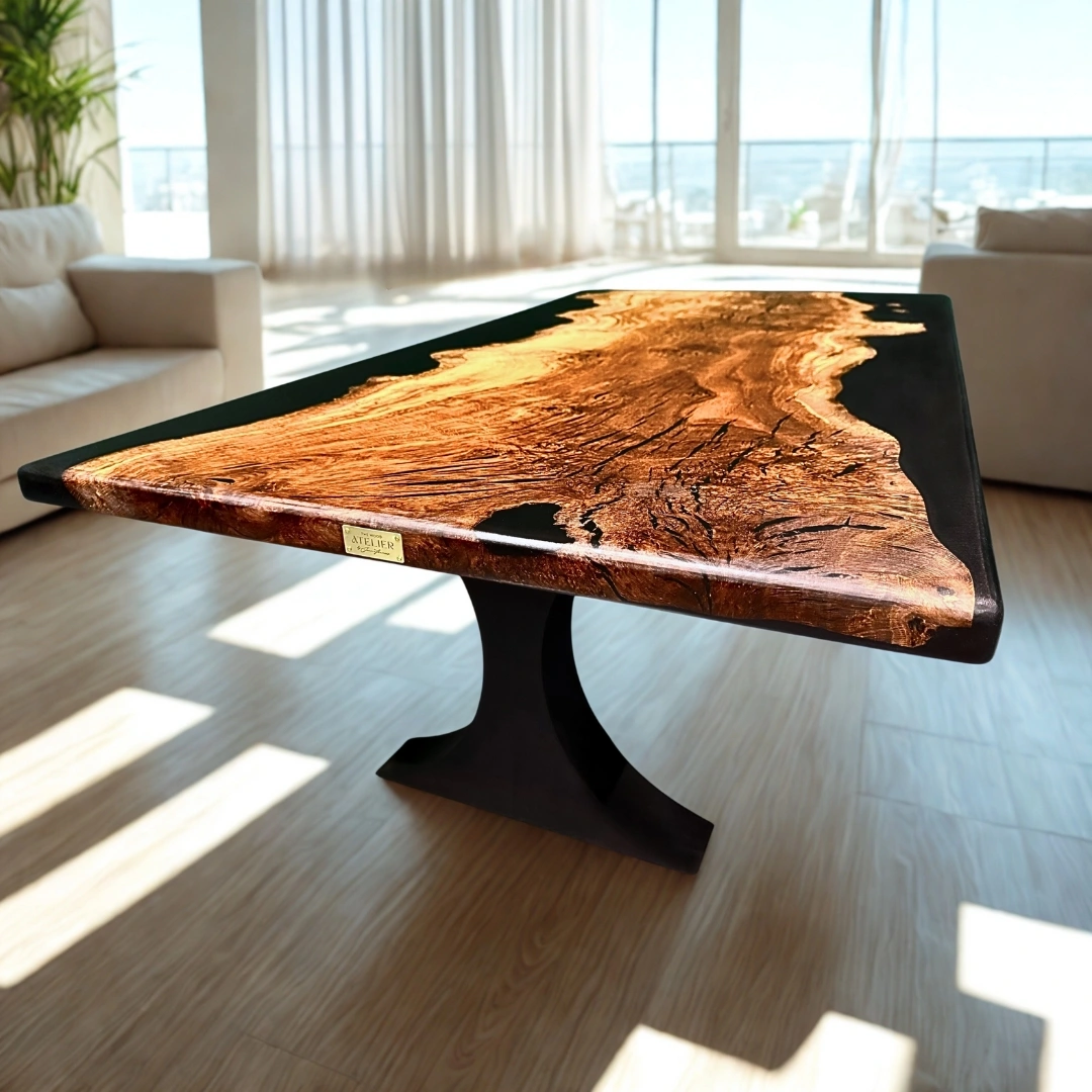 The wood’s natural markings recall grooves traced by formidable claws, while black resin flows through them, sealing motion into stillness.