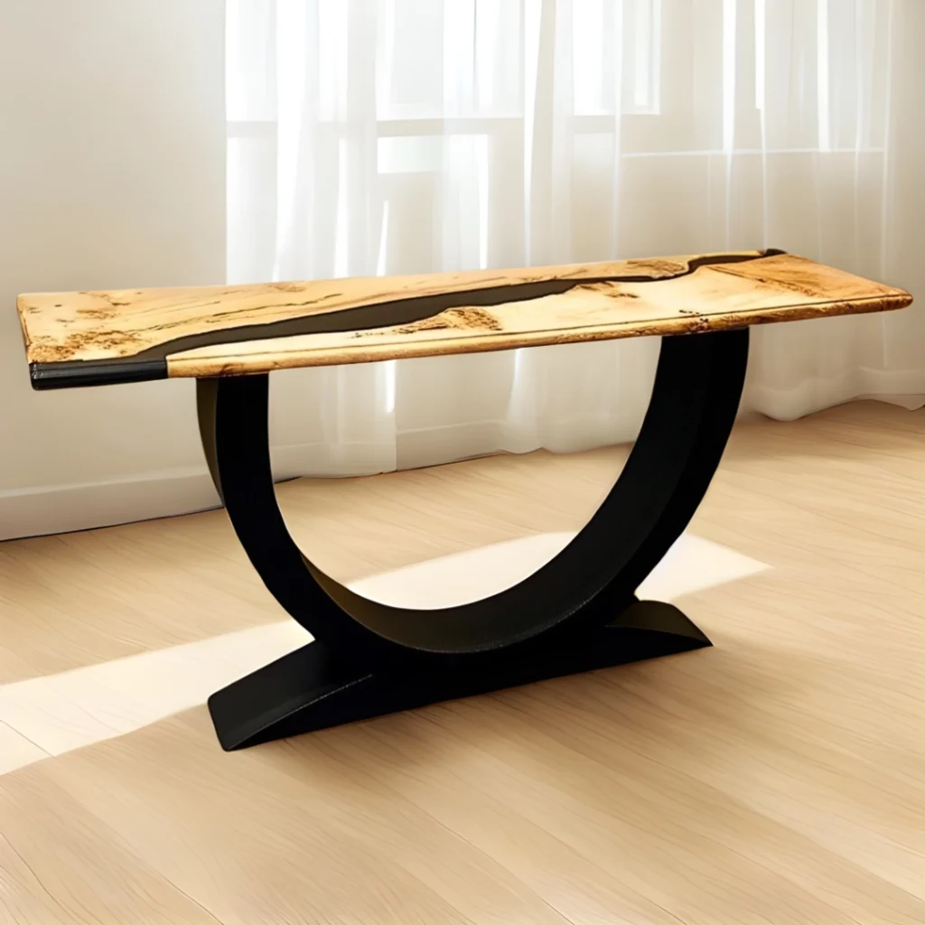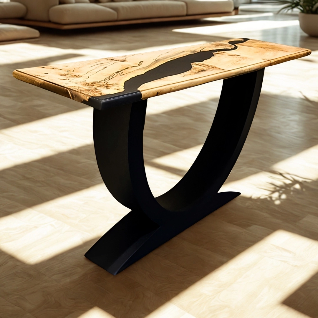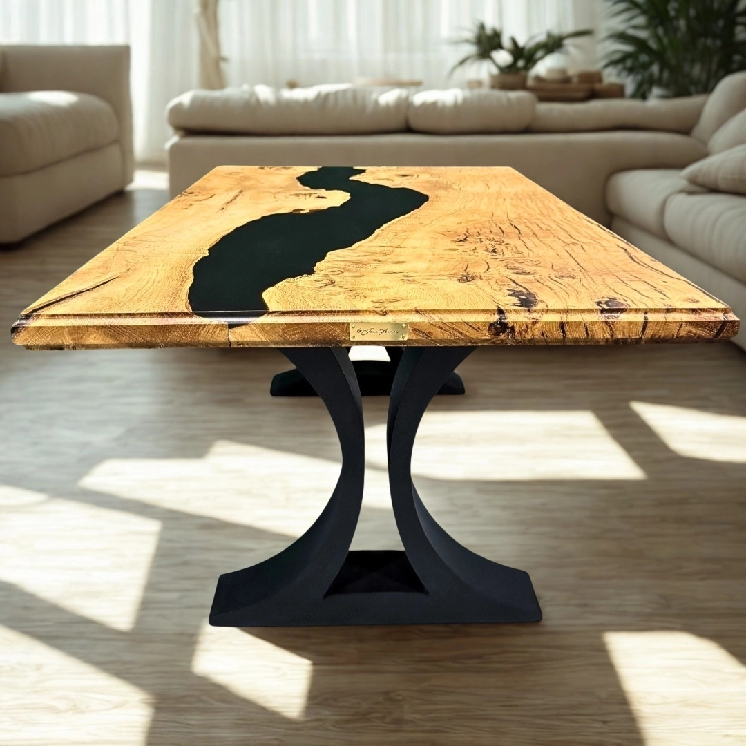 The wood’s natural markings recall grooves traced by formidable claws, while black resin flows through them, sealing motion into stillness.